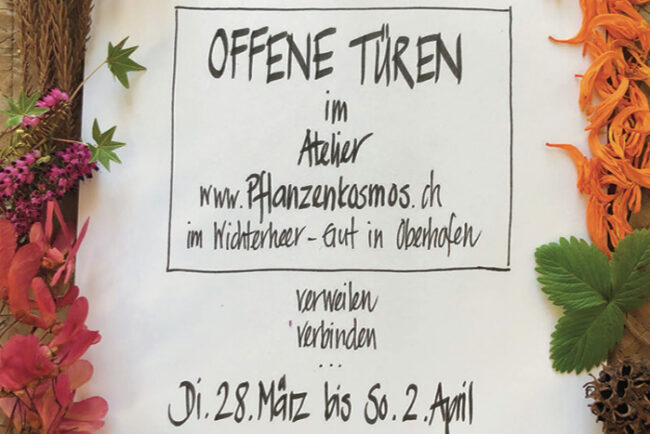 Mit Ursula Wahlen von pflanzenkosmos verbindet mich die Liebe für die Natur und die Freude an der Schönheit und der Magie der Pflanzenwelt. So freut es mich sehr, dass ich am Rahmenprogramm der Tage der Offenen Türe in Ursulas Atelier mit meinen Klangschalen mitwirken darf.